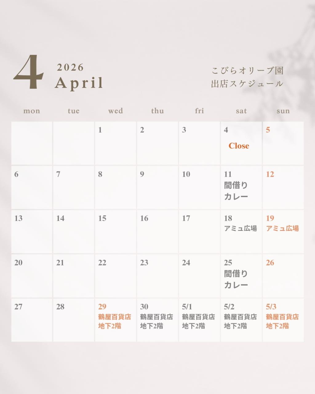 4月の出店カレンダーです。